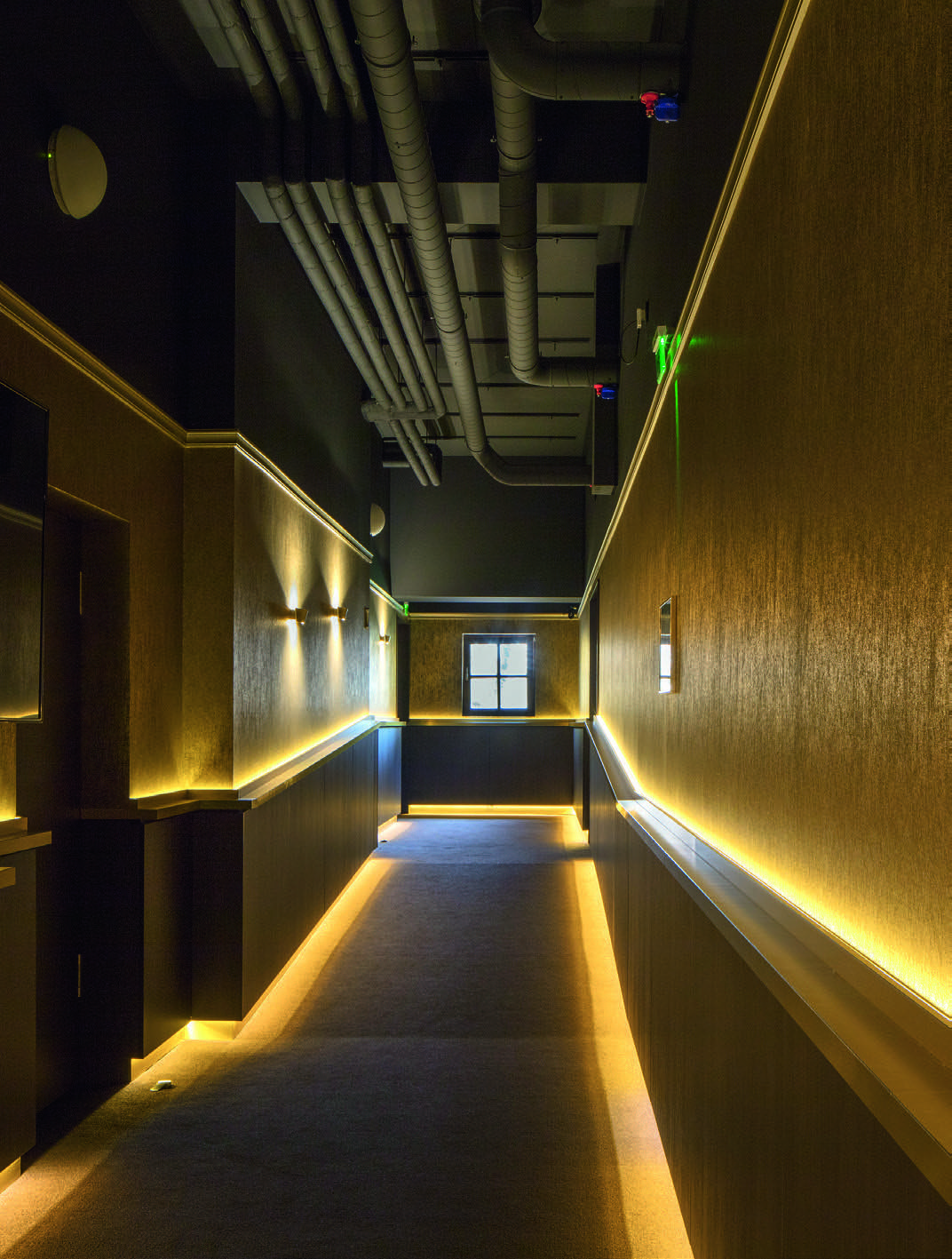 Abb.: Der Besucher wird durch die dynamischen Lichtlinien in die Kinosäle hineingeführt. Der Gang wird durch warmweißes, indirektes LED-Licht beleuchtet. Messingfarbig eloxierte Wandleuchten setzen zusätzliche Lichtakzente. Neben der Minderung akustischer Störgeräusche dient diese »Zwischenschleuse« dazu, dass sich die Augen des Kinobesuchers an die dunkleren Lichtverhältnisse im Saal sanft anpassen.