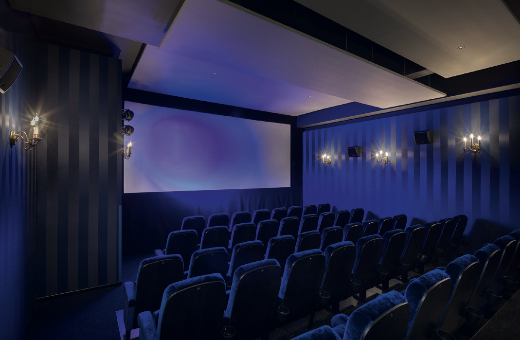 Im blauen Saal mit rund 70 Sitzplätzen erhielten auch die kleineren, dreiarmigen Messingleuchten wieder ihre Bestimmung. Mit Filamentleuchtmitteln bestückt, aber hier in Kerzenbirnenform mit E14-Fassung, und in Kombination mit der dunkelblau gestreiften Stoffbespannung der Wände, erinnert der Saal ein wenig an das Schloss aus dem Disneyfilm »Die Schöne und das Biest«. Natürlich sind in diesem Raum die LED-Stufenprofile der Podeste passend in blau gewählt. Da es im kleineren Saal keinen Vorhang gibt, werfen ein weißer und ein blauer Bühnenstrahler Lichteffekte auf die Bildwand.