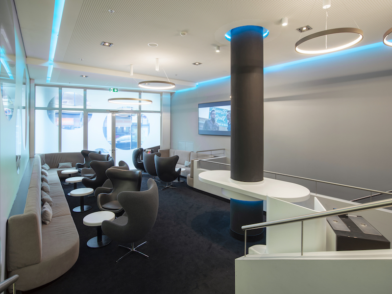 In addition to introductory film sequences displayed on one of the curved pathway walls, patrons are accompanied on their way to the auditorium by blue, indirect strips of light to the left and right, above and below. These are the only light source here and they continue in the auditorium. A surrounding blue strip of light ties the space together and culminates in a sort of halo, framing the movie screen. The colour of this lighting effect, which is affectionally referred to as “Dolby Blue”, appears quite magical and is reminiscent of the atmosphere of our blue planet.