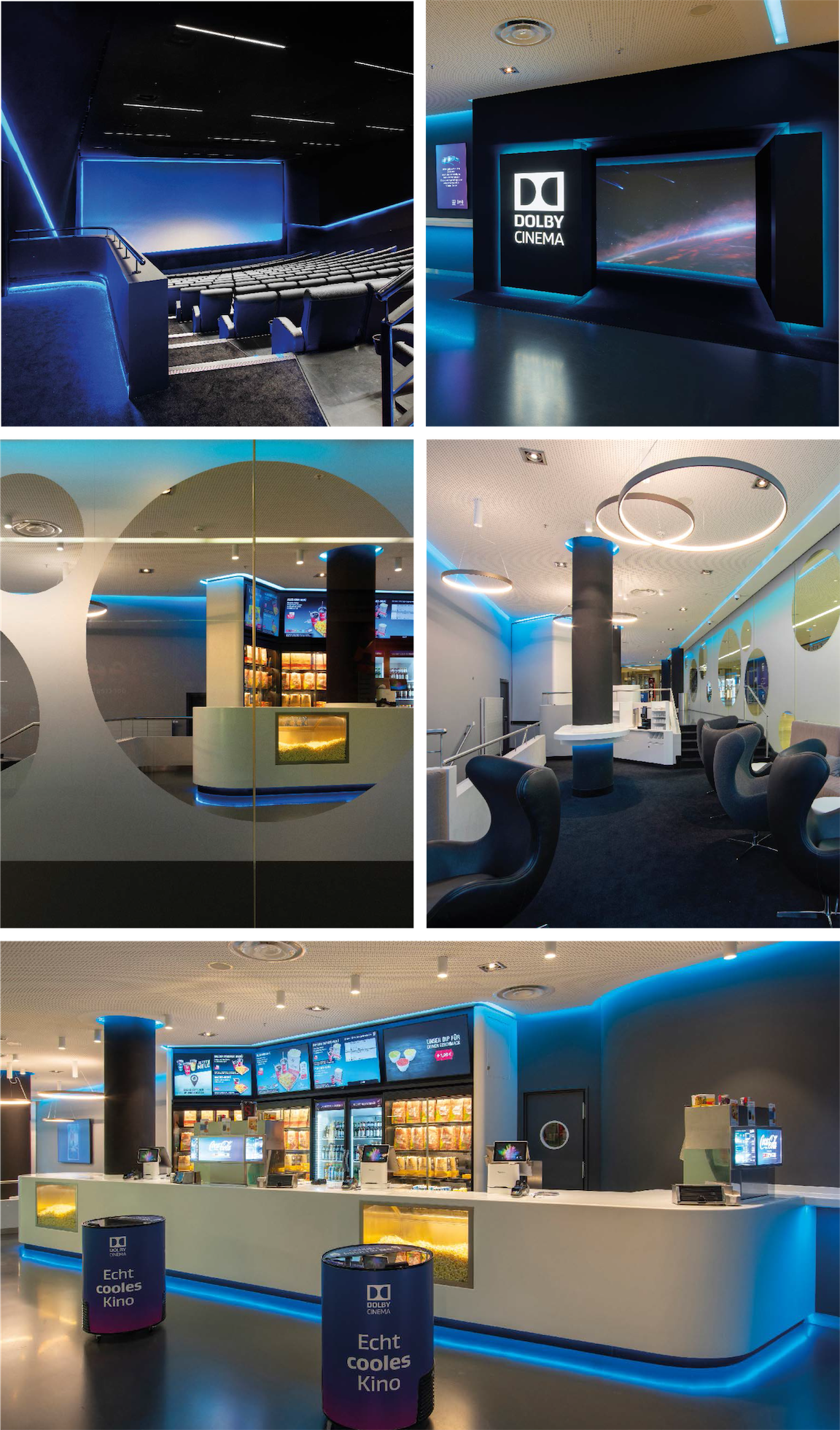 Five halls, “like thrown the dice” in a game, are connected by a foyer whose centre forms an ellipse. This idea was taken up for the interior design by assigning each hall its own color on the side facing the foyer and reiterating it as a line structure on the ceiling towards the centre of the foyer. The result is a grid of indirectly illuminated LED light pro les that overlap from five directions and at regular intervals. Each light line can be controlled separately in RGB and warm white. When an auditorium is ready for admission, both foyer levels and the doorway to the space are illuminated in the respective color. For times between films or during special events, the entire foyer is bathed in one color or changes in an interplay of color compositions and rainbow effect. In the five cinema halls, the design concept of staggered, horizontal lines is repeated, running across the back and side walls and playing in freely selectable colors and scenarios.